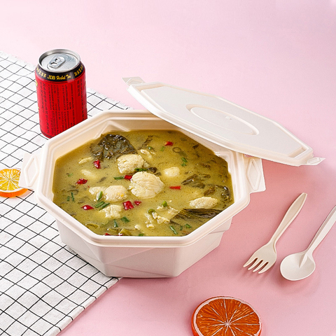 Contenedor octogonal de comida para llevar de gran capacidad ecológico con tapa Fiambrera biodegradable de almidón de maíz al por mayor OEM personalizado